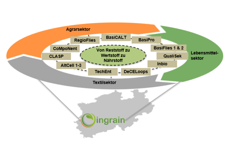 Eine intelligente Vernetzung von Agrar-, Textil- und Lebensmittelwirtschaft ist die Basis für einen innovationsbasierten Strukturwandel in der INGRAIN-Region. Ziel ist die Etablierung einer branchenübergreifenden, ressourcenschonenden und biobasierten „Circular Economy“. Stakeholder aus dem Kreis Heinsberg und aus den benachbarten Regionen werden zu einem starken Bündnis von Akteur*innen aus Wirtschaft, Wissenschaft und Gesellschaft geformt.