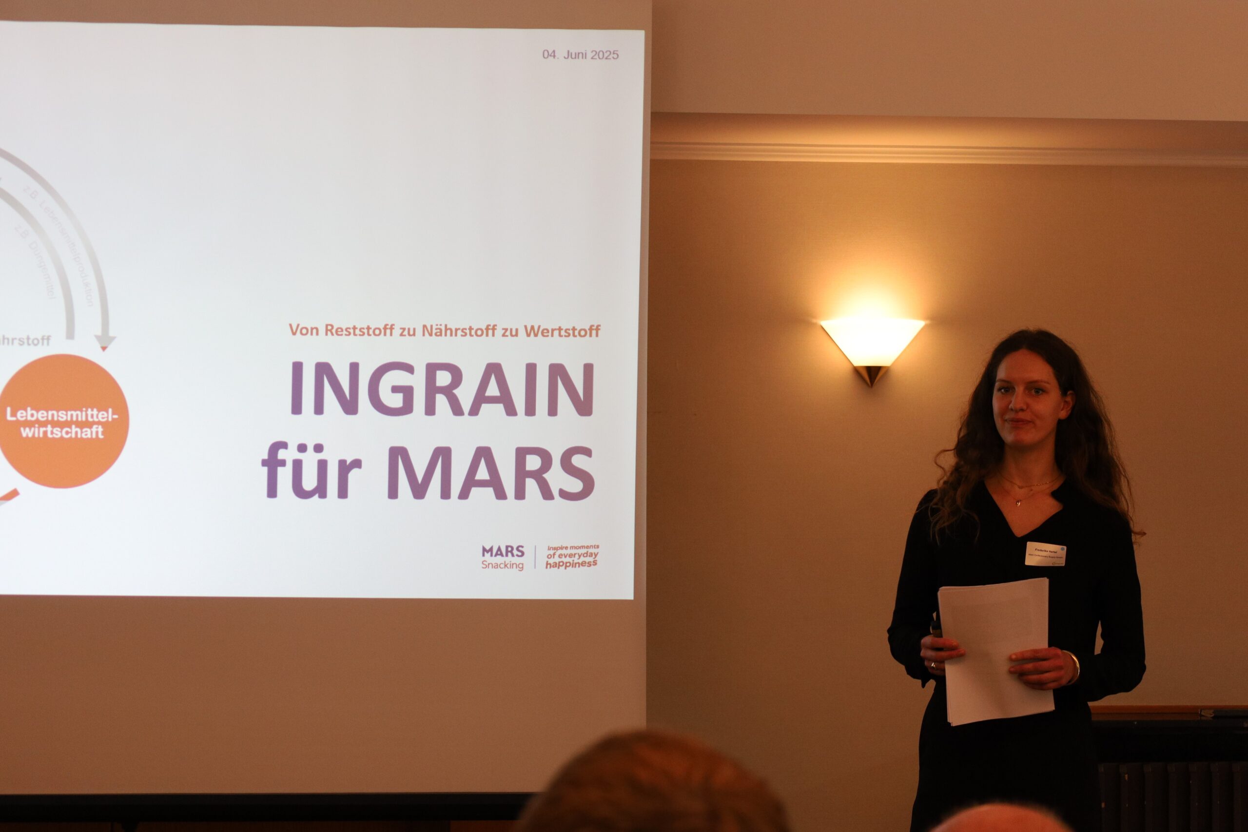 - Mars Confectionery Supply GmbH gewährte Einblicke in ihre ambitionierten Nachhaltigkeitsstrategien und Reststoffverwertung. Frederike Hertel, Nachwuchsführungskraft Produktion, stellte das Projekt „Regio Flies“ vor, bei dem Reststoffe durch Insekten verwertet werden. Sie unterstrich das Potenzial weiterer Zusammenarbeit im INGRAIN-Bündnis zur Ausschöpfung biobasierter Wertschöpfungsketten.