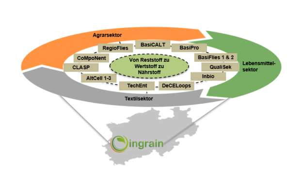 Eine intelligente Vernetzung von Agrar-, Textil- und Lebensmittelwirtschaft ist die Basis für einen innovationsbasierten Strukturwandel in der INGRAIN-Region. Ziel ist die Etablierung einer branchenübergreifenden, ressourcenschonenden und biobasierten „Circular Economy“. Stakeholder aus dem Kreis Heinsberg und aus den benachbarten Regionen werden zu einem starken Bündnis von Akteur*innen aus Wirtschaft, Wissenschaft und Gesellschaft geformt.