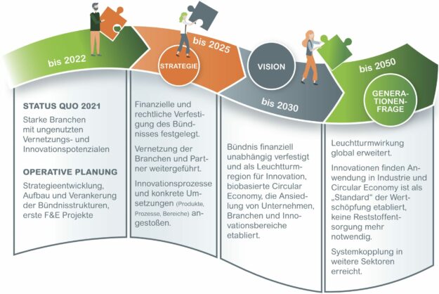 Um die Verstetigung von INGRAIN nachhaltig zu gestalten, ist eine Vision und langfristige Gesamtstrategie des Bündnisses unerlässlich. Diese sieht übergeordnet eine Erschließung bisher ungenutzter Biomassepotenziale für die biobasierte Circular Economy vor. Dieses Ziel soll bis 2050 in fünf festgelegten Zwischenschritten erreicht werden.
